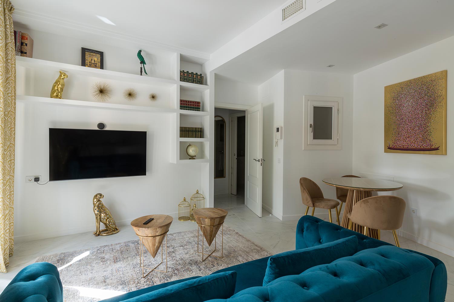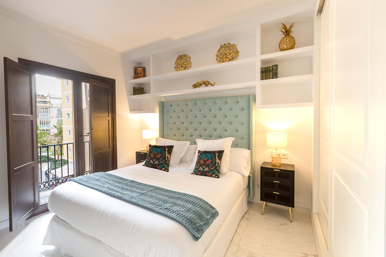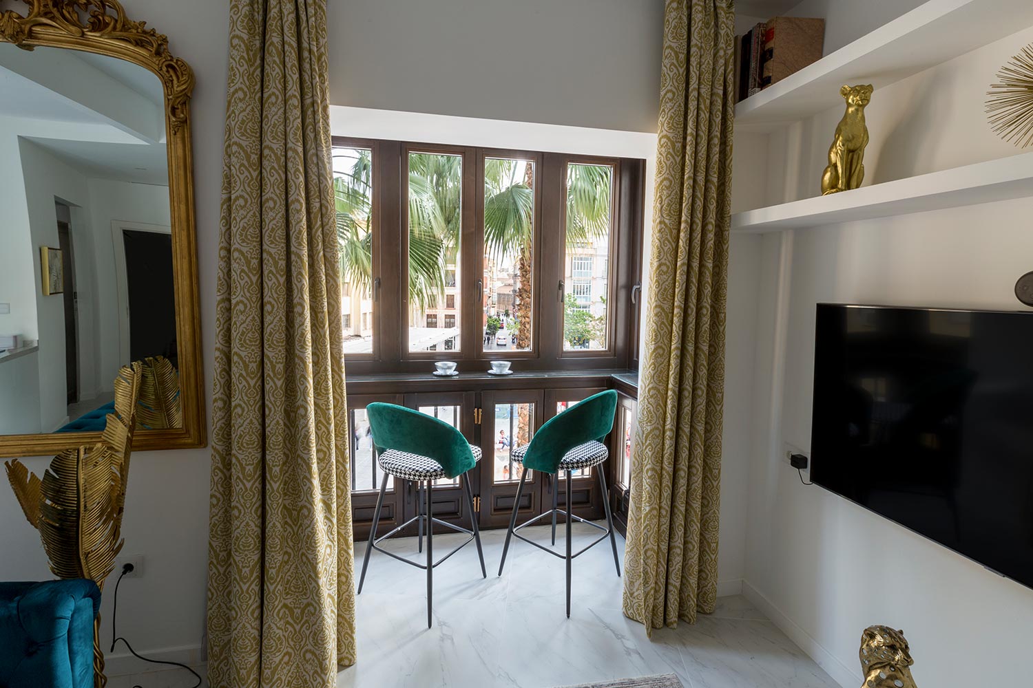 La Suite GATSBY es un apartamento de 65 m2 con acceso privado y directo en ascensor. Se divide en 2 espacios: un dormitorio con baño en suite y un salón-comedor con cocina americana. Dispone de dos grandes ventanales con balcones y de una veranda con vistas a una plaza peatonal, una de las más emblemáticas del centro histórico de Málaga y al mercado central Atarazanas.